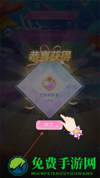 4、完成关卡任务,出现恭喜获得提示,点击收下按钮,获取奖励如巴啦啦能量,用于后续培养小魔仙。