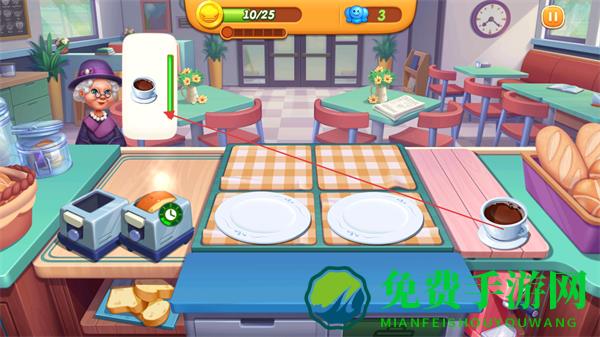 4、将做好的餐点交付给顾客,获取金币,提升金币数量,避免顾客情绪值降低,完成金币目标通关。