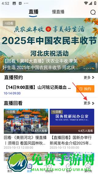 2、在直播页面,点击直播回看右侧的更多,进入直播回看列表页面。