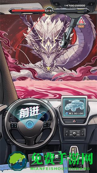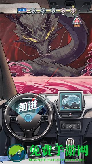 1、点击前进按钮开车上路,遭遇强大怪物如龙形怪物时,观察怪物攻击节奏。