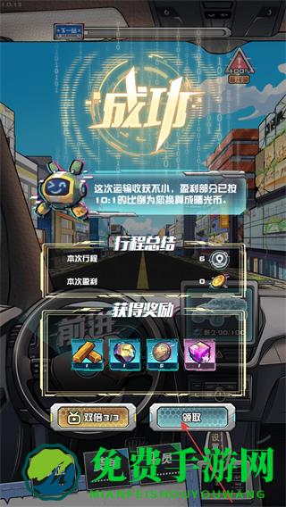 4、成功抵达目的地,看到成功提示后,点击领取按钮,获取奖励,用于升级车辆和装备。