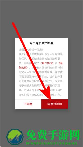 1、打开温度新闻,在弹窗中点击同意并继续。