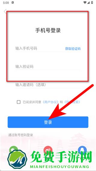 3、输入手机号码、验证码,勾选后,点击登录,完成注册。