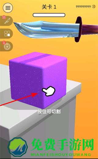1、执行切割操作,按住物品如紫色方块、西瓜,使用刀具进行切割,完成关卡的切割任务。
