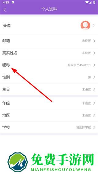 3、在个人资料页面中,点击昵称选项,进入昵称修改页面。