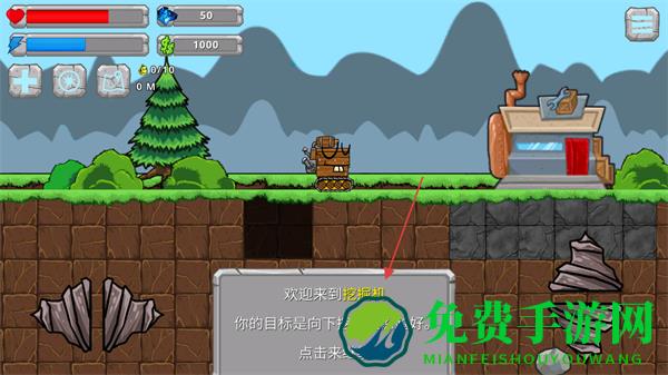 1、进入游戏,阅读提示信息,明确目标是操控挖掘机向下挖得越深越好,点击屏幕继续游戏。