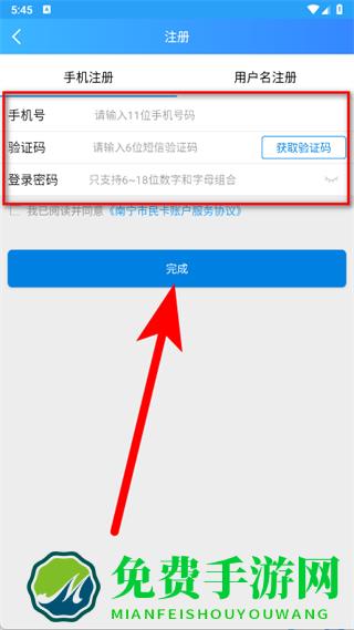 4、输入11位手机号码,点击获取验证码,点击完成按钮,完成账号注册。