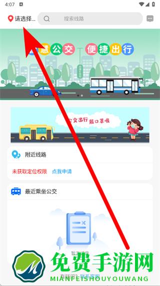 1、打开公交e出行,点击页面左上角请选择,完成城市选择设置。