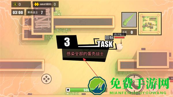 1、游戏开始,查看屏幕上方信息,明确目标为感染全部的蛋壳战士,记住剩余战士数量如7和倒计时如03:00。