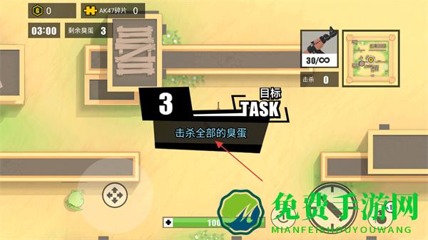 1、进入游戏,查看屏幕上方信息,明确剩余时间如03:00、剩余臭蛋数量,知晓目标是击杀全部的臭蛋。
