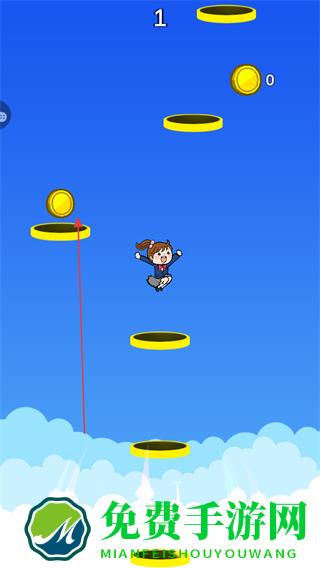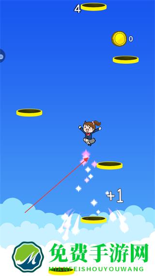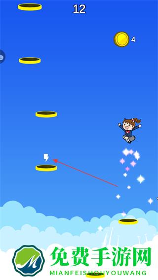 1、进入游戏,操控角色起跳,使其跳到上方的圆形平台上,每成功跳到一个平台,分数屏幕左侧数字增加。