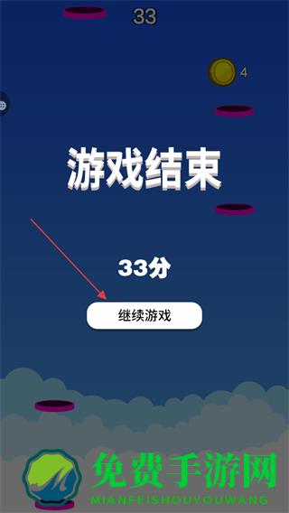 4、若角色未能跳到平台上导致掉落,游戏结束,可点击继续游戏重新挑战。