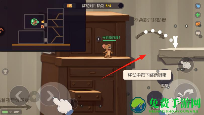 3、角色光明庚柠檬,任务移动到目标点3/4,操作提示移动中按下跳跃键哦,还有加速等技能按钮。