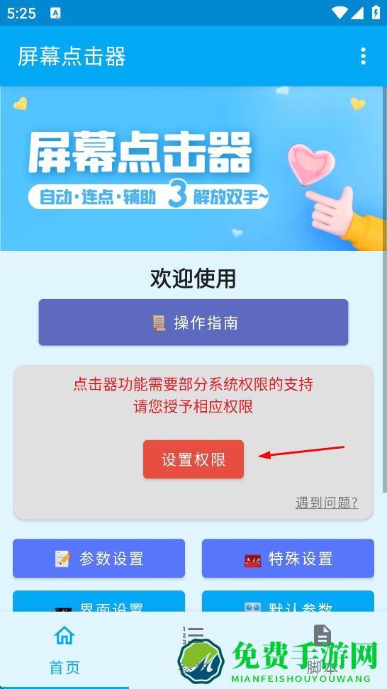 1、打开屏幕点击器APP,点击“设置权限”按钮,授予APP所需的系统权限。