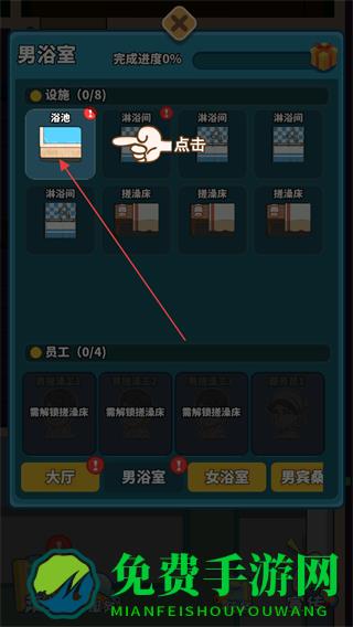 2、在菜单中选择男浴室相关内容,点击浴池准备进行设施设置。