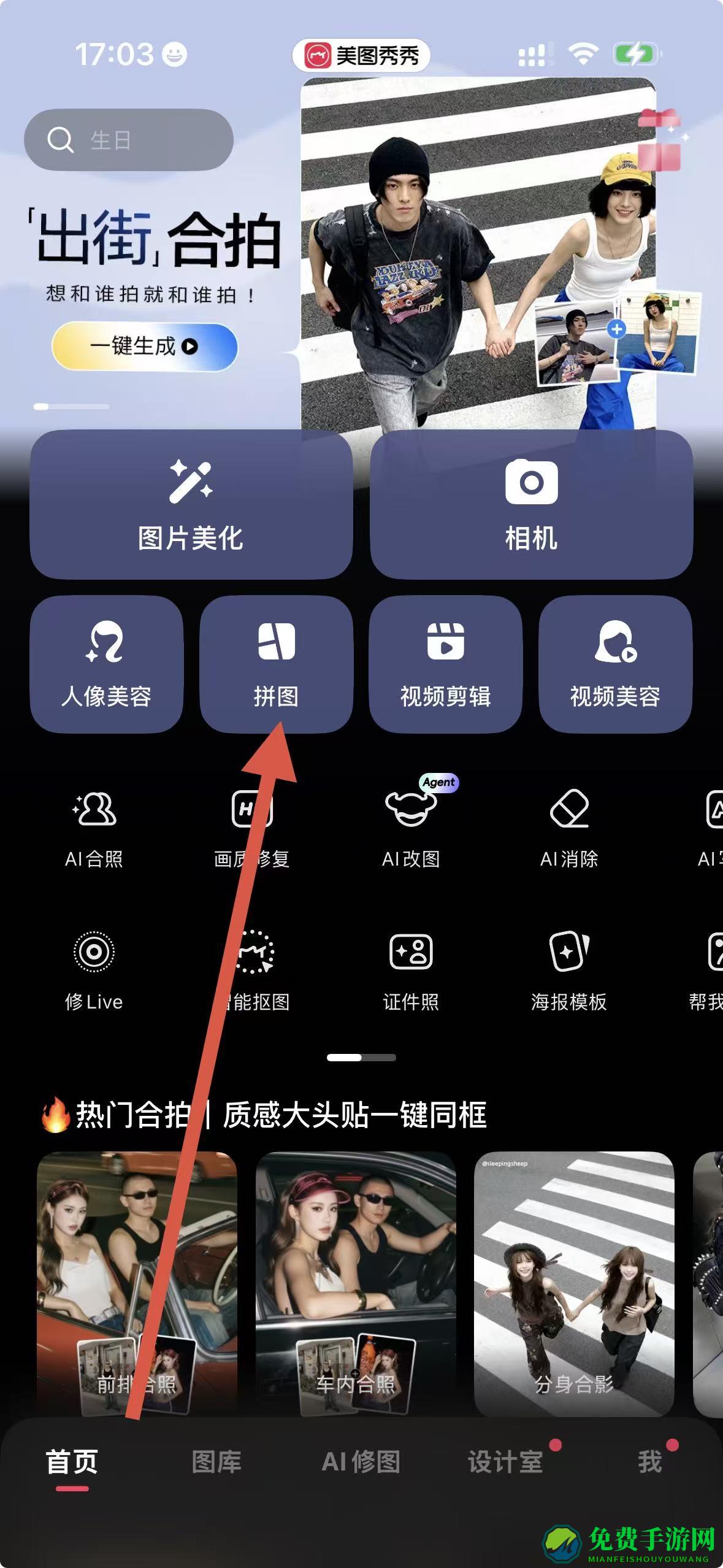 1、打开美图秀秀进入首页,点击拼图选项,进入图片选择页面。