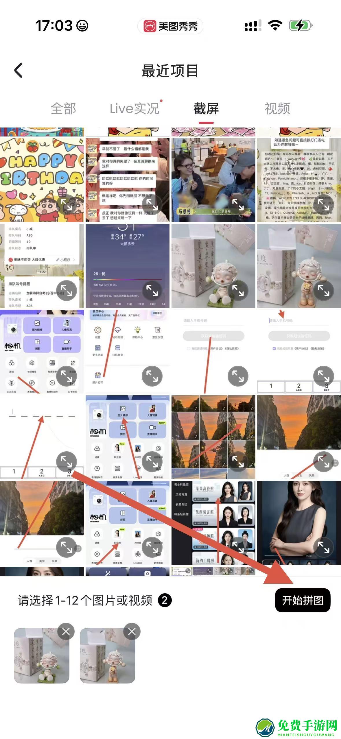 2、在图片选择页面,从最近项目里挑选1-12个想要拼接的图片或视频,点击开始拼图。