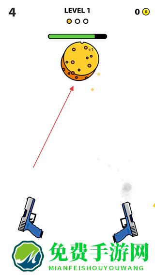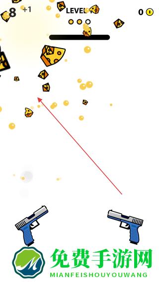 1、进入游戏,查看屏幕上方显示的关卡信息LEVEL1和剩余子弹数,点击屏幕开枪射击上方目标物,如奶酪。