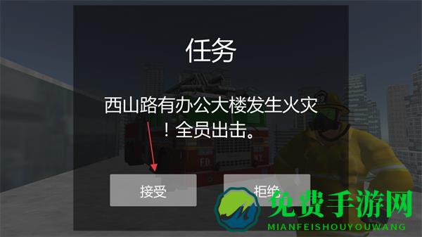 1、游戏中出现任务提示西山路有办公大楼发生火灾!全员出击,点击接受按钮承接任务。