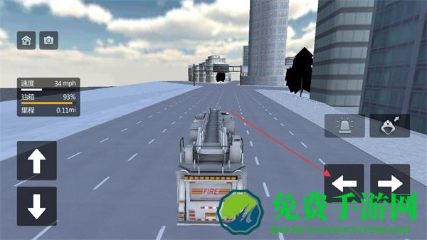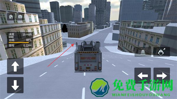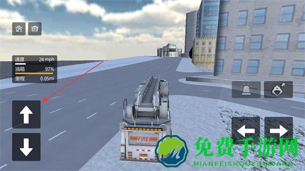 2、通过屏幕左侧的上下箭头按钮控制消防车前进或后退,留意速度,油箱,里程等信息。