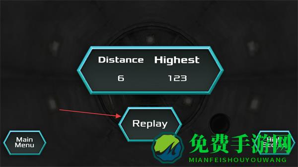4、当游戏结束,屏幕会显示飞行Distance距离和Highest最高记录,点击Replay按钮可重新挑战。