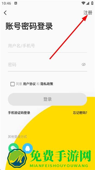 3、在账号密码登录页面,点击右上角注册,进入注册新账号页面。