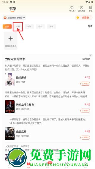 2、在书架页面,点击小说分类标签,筛选小说类内容。