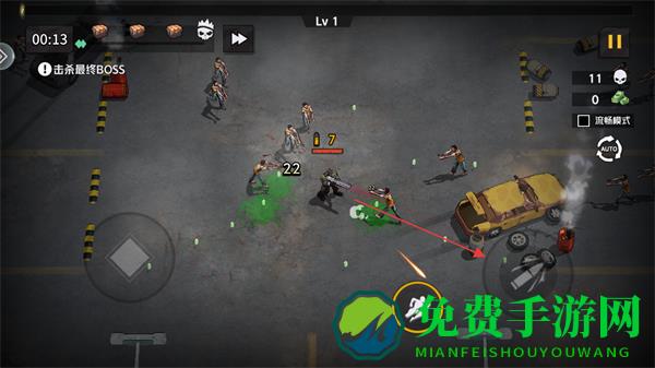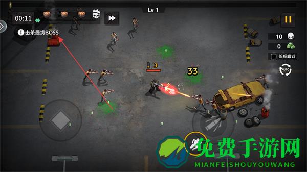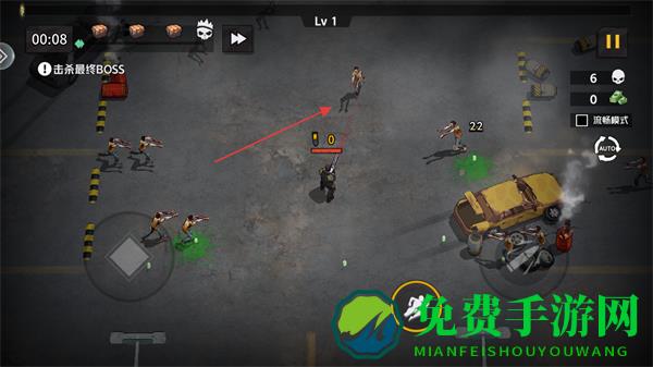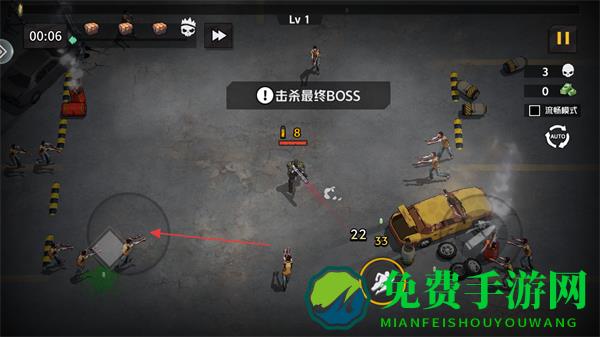 1、进入游戏看到等级为Lv1,明确关卡目标是击杀最终BOSS,通过虚拟摇杆移动角色。