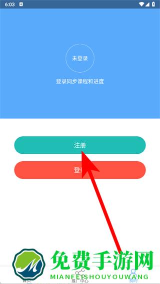 2、进入我的页面后,点击注册按钮,进入手机注册页面。