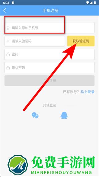 3、在手机注册页面,输入手机号码,点击获取验证码。