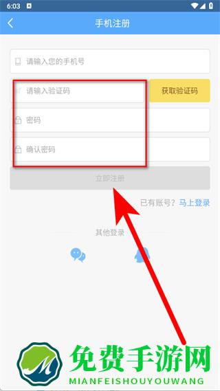 4、输入收到的验证码,设置密码并再次确认密码,点击立即注册,完成注册。