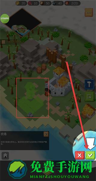 3、将农场拖拽到合适的地皮上后,点击下方打勾按钮即可进行建造。