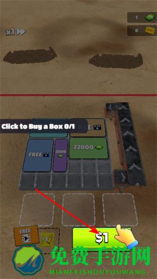 4、点击绿色的$1按钮购买箱子,完成“Click to Buy a Box0/1”任务,通过不断购买和布局箱子来推进游戏进程。