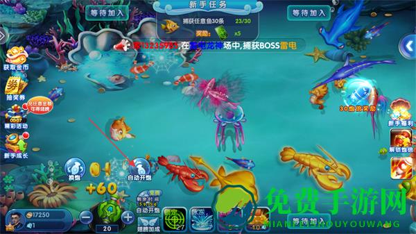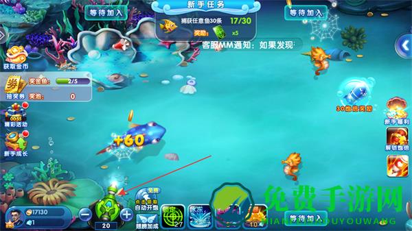 2、持续发射渔网捕捉游动的各类鱼,推进新手任务进度,留意捕获鱼后获得的金币。