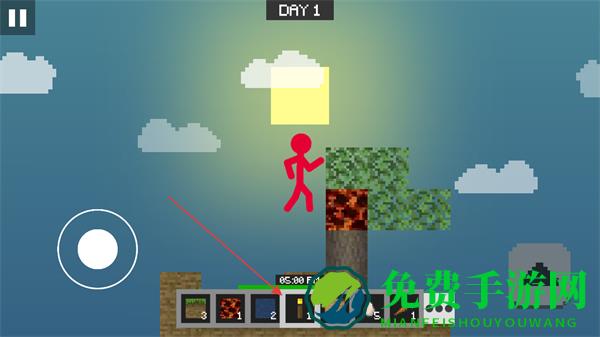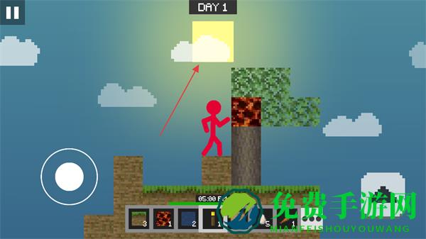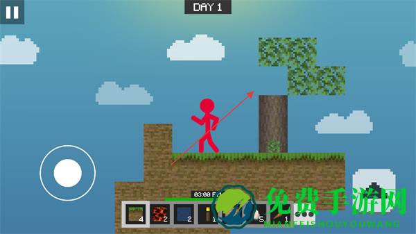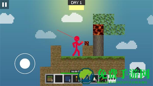 1、操控左侧虚拟摇杆移动火柴人,在空岛中探索树木等资源点。