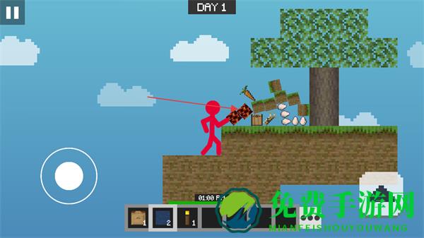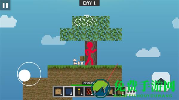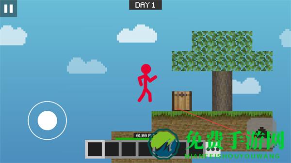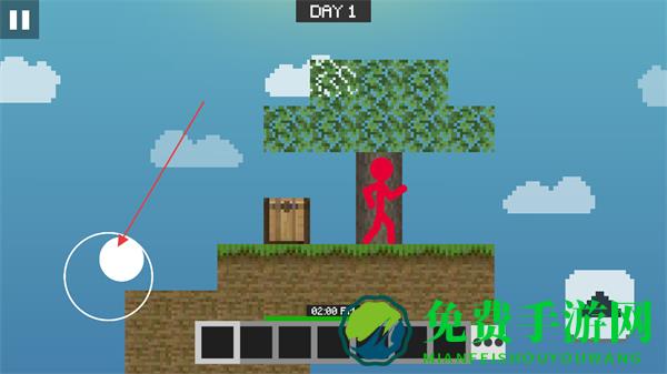1、操控左侧虚拟摇杆移动火柴人,在空岛中探索,留意资源分布。
