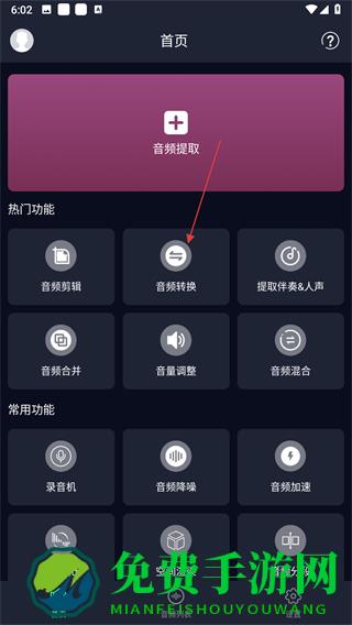 1、打开音频提取器应用,在首页的热门功能区域,点击音频转换选项。
