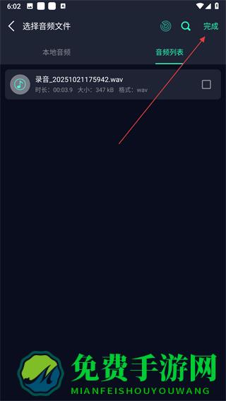 2、在音频列表中选择你想要转换的音频文件,然后点击右上角的完成按钮。