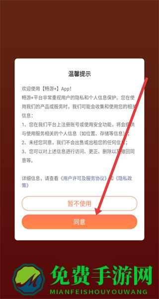 1、打开畅游APP,弹出温馨提示窗口,点击同意后进入。
