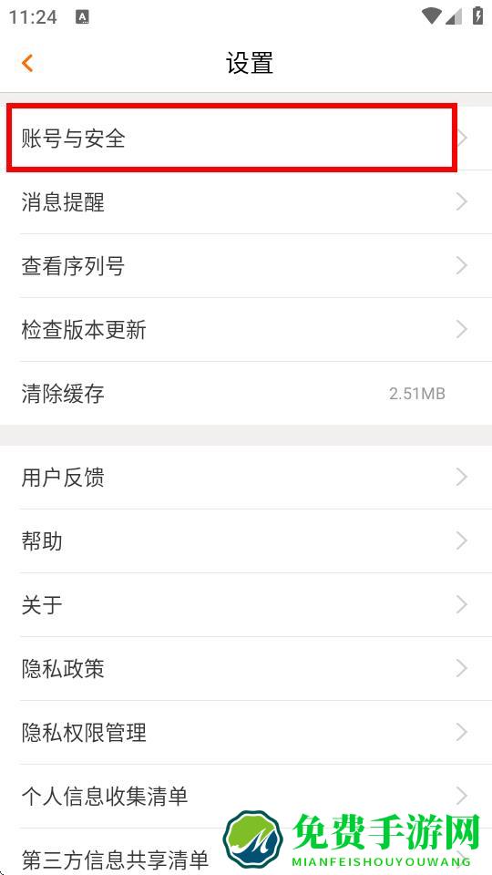 3、在设置页面里,点击账号与安全选项,进入账号安全相关界面。