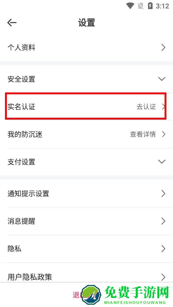 3、在设置界面里找到实名认证选项,点击右侧的去认证。