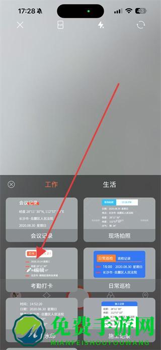 2、在拍摄界面,选择考勤打卡水印模板并应用。