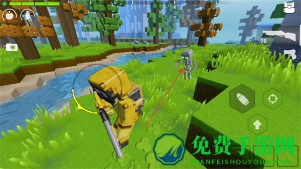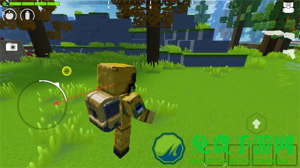 1、操控角色在方块世界移动,左侧摇杆控制方向,探索草地、树林等区域。