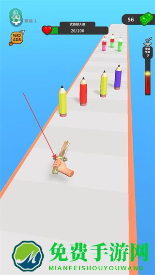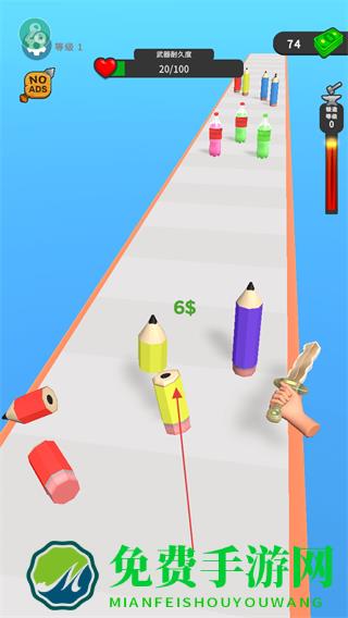 1、在跑道上操控武器如剑,切割彩色铅笔等物体,获取金币奖励。