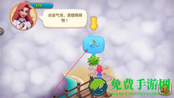 1、根据提示点击气泡,消耗资源清理障碍物,逐步探索场景。