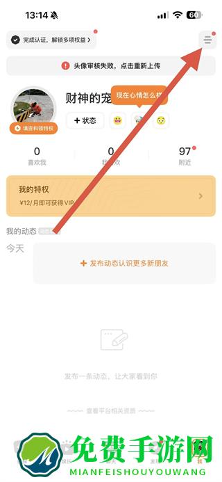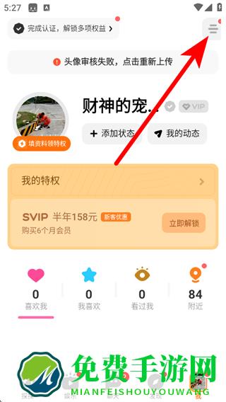 1.打开探探APP,点击右上角的三条横线菜单按钮。