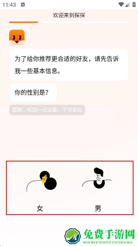 3、完成登录后,进入信息设置页面,首先需要设置性别,根据自身情况,在“女”和“男”选项中选择其中一个。