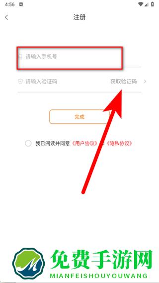 5、输入收到的验证码,勾选同意后,点击完成,完成账号注册。