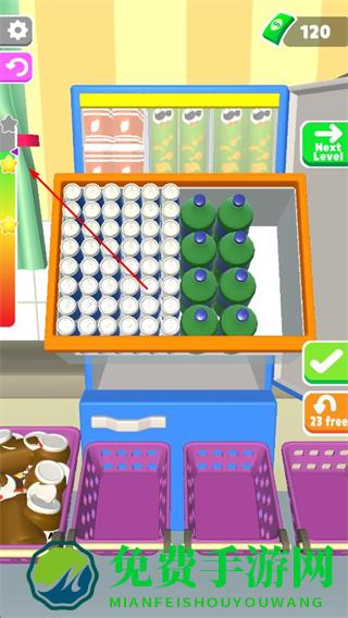 2、摆放物品时,要注意物品的形状和大小,尽量填满冰箱空间,左侧为此时关卡的星星颗数。