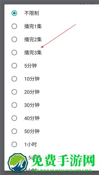 2、进入选择时间限制的页面内,选择并点击播完3集的按钮。